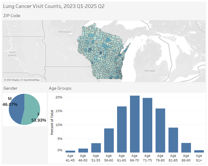 The WHA Information Center analyzed all lung cancer diagnosis claims from January 2023 through June 2025. In this timeframe, 2024 Q4 held the highest visits for lung cancer at roughly 16,500 visits. The number of visits was higher in females than males. The CDC finds that nationally, males have higher rates of being diagnosed with lung cancer than females. The highest age group of lung cancer visits is 66-70 years old with the median age being 70, which aligns with the national median age. The Wisconsin county with the highest number of visits is Milwaukee County.
